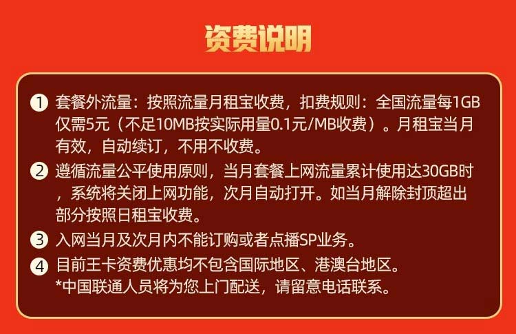 3、套餐内包含30GB定向专属流量,使用超出部分按照月租宝收费,扣费规则: 当月使用套外流量累计0-100MB不计费,累计使用100MB-1GB计费5元/1GB/月。当月触发多个月租宝重复按照上述规则计费。月租宝当月有效,自动续订,不用不收费。